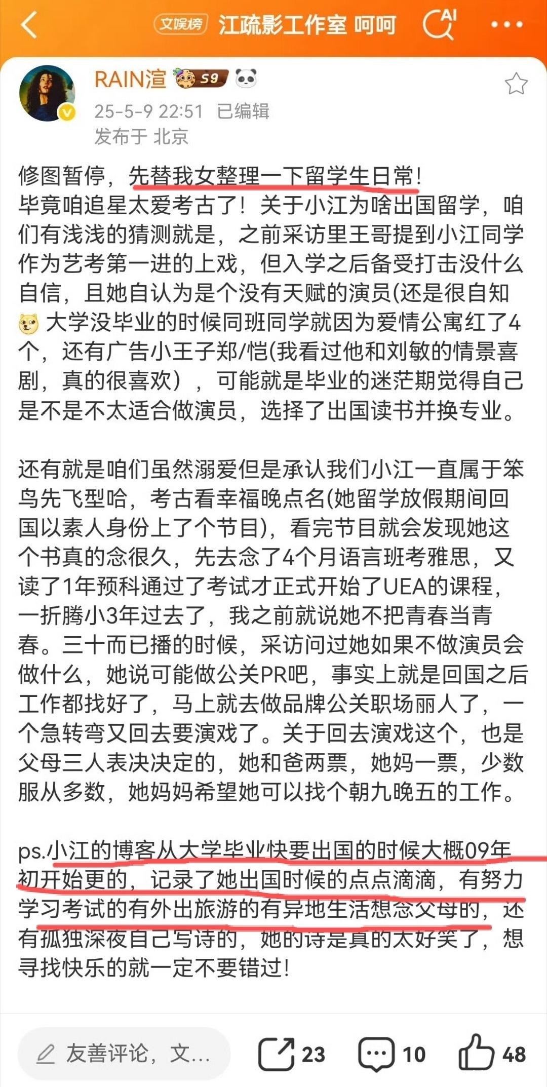 关键时刻,粉丝翻出江疏影2009年留学期间的个人博客记录作为铁证:那时她每日坚持撰写学习笔记、考试心得,连日常采购清单都会详细记下,生活轨迹清晰可查,何来“海外产子”的可能?