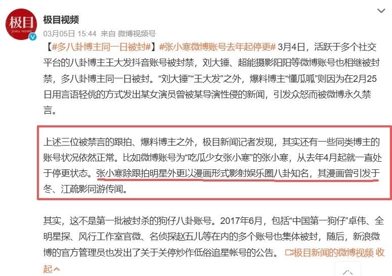 事实上,自去年4月起,张小寒的社交媒体账号已停止更新,今年3月,多个知名八卦博主的账号也陆续遭到平台封禁处理。