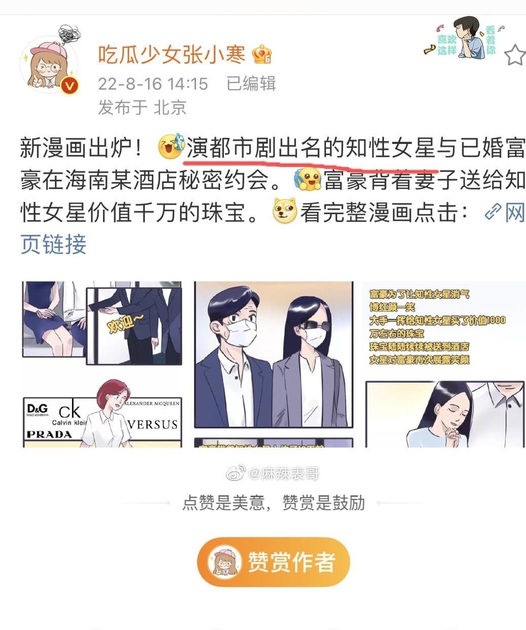 事件始于2022年,娱乐博主张小寒发布一组手绘漫画,影射一位“主演都市情感剧的知性女演员”与已婚富豪在海南某酒店秘密会面,并收受价值超千万元的珠宝馈赠。