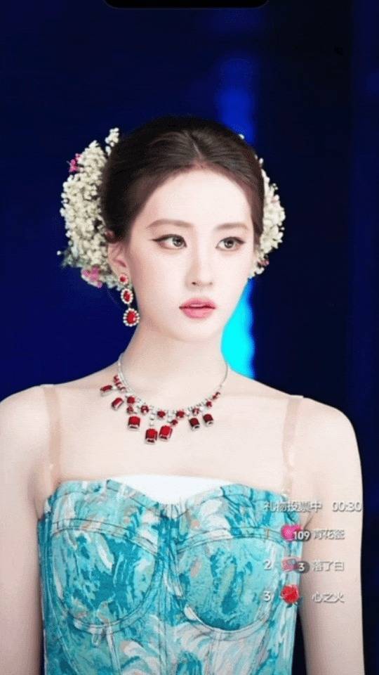 镜头前,一位长相酷似刘亦菲的主播“柳柳”身穿蓝色抹胸礼服,发间点缀着几簇满天星,脖子上还戴着一串红宝石项链,显然是在复刻刘亦菲此前刷屏的满天星妆造。